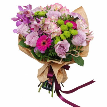 - Buchet de flori in kraft trandafiri si orhidee in nuante de mov si roz279,00 LeiLivrare: Bucuresti si Orase mari