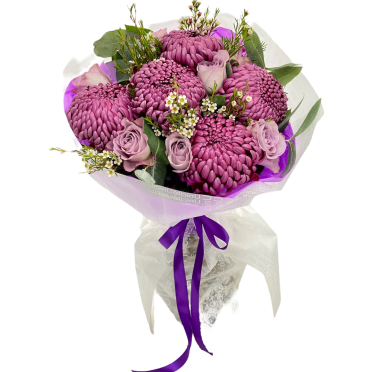 6. Crizanteme si trandafiri mov in buchet, zi de nastere