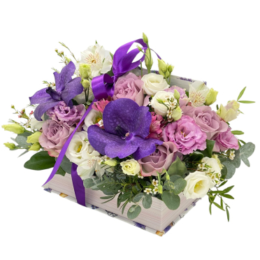 12. Aranjament floral in cutie carte, flori mov, trandafiri, orhidee