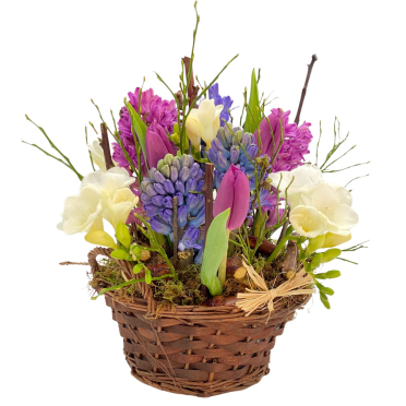 - Zambile, frezii si lalele in aranjament floral in cos cu crengi de mar322,00 LeiLivrare: Bucuresti si Orase mari