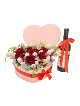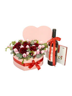 - Aranjament floral in cutie inima roz cu trandafiri rosii lalele roz si sticla de vin720,00 LeiLivrare: Bucuresti si Orase mari