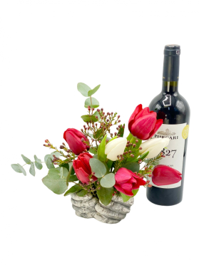 - Aranjament floral vas de ceramica Maini cu lalele rosii si albe sticla de vin290,00 LeiLivrare: Bucuresti si Ilfov