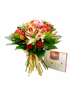 - Buchet cu amarilis, trandafiri, lalele, bujori rosii si portocalii bomboane merci520,00 LeiLivrare: Bucuresti si Ilfov