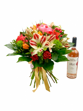- Buchet cu amarilis, trandafiri, lalele, bujori, roșu - portocaliu si sticla de vin643,00 LeiLivrare: Bucuresti si Orase mari